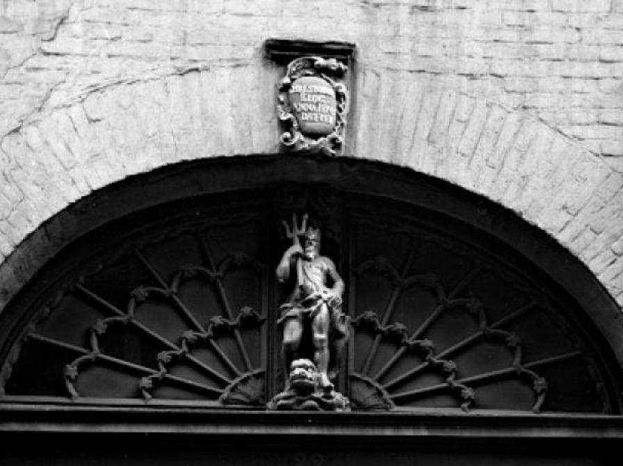 Over porten ses et relief med følgende tekst: "CHRISTOFFER / KLOG / ANNA JENS / DATTER". Under relieffet står en Neptun-figur.